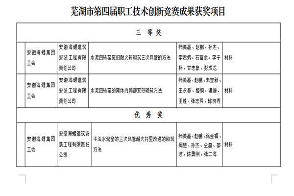 近日,蕪湖市總工會、蕪湖市科學技術局、蕪湖市發(fā)明協(xié)會等三家單位聯(lián)合組織開展了職工技術創(chuàng)新競賽活動,海螺建安公司首次參加此項活動,申報三個項目全部獲獎。