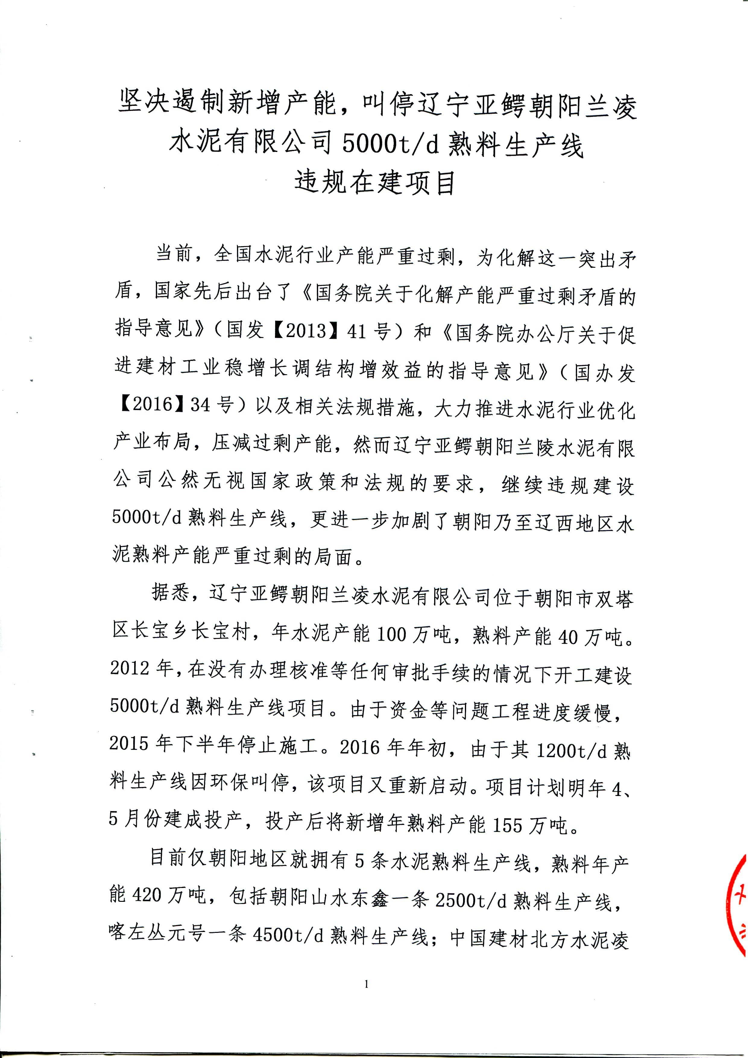 近日,有網(wǎng)友向水泥人網(wǎng)爆料,遼寧亞鱷朝陽蘭凌水泥有限公司5000t/d熟料生產(chǎn)線違規(guī)建線,和其它舉報不一樣的是,本次舉報是由山水水泥、北方水泥、三鴿水泥、遼寧建材協(xié)會聯(lián)名舉報,舉報材料如下: