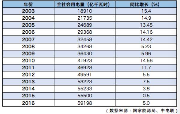去年2月發(fā)布的《2016年度全國電力供需形勢(shì)分析預(yù)測(cè)報(bào)告》中,中電聯(lián)對(duì)全年用電量增速給予了低預(yù)期:在考慮常年氣溫水平的情況下,預(yù)計(jì)2016年全社會(huì)用電量同比增長(zhǎng)1%-2%。之所以如此悲觀,是由于2015年全社會(huì)用電量同比增長(zhǎng)僅0.5%,較2014年回落了3.3個(gè)百分點(diǎn),增速為1974年以來年度最低水平。
