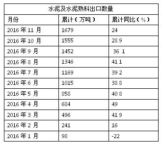 截至11月,2016年水泥及水泥熟料出口量已達(dá)到1679萬噸,同比增長24%,增速相比10月有所放緩。