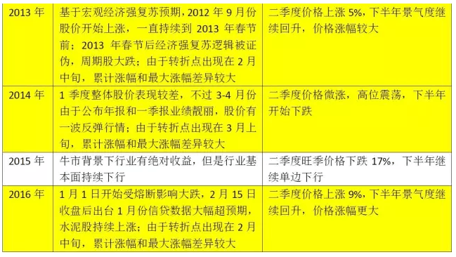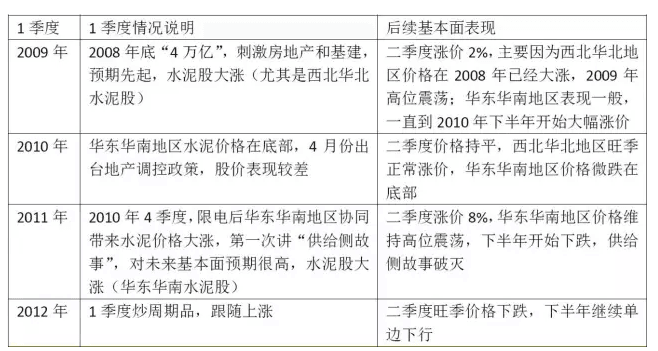 單看水泥股,是否也存在春季躁動?我們選取了2009年以來的數(shù)據(jù),分別用季度累計漲幅和季度內(nèi)最大漲幅兩個指標來衡量;結(jié)論還是比較清晰:一方面,大部分年份1季度都是正收益(出現(xiàn)負收益的年份特征都很明顯,下文會說明),而且如果擇時得當,會有不錯斬獲(最大漲幅都比較大);另一方面,大部分年份,1季度的“最大漲幅”都大于其他三個季度,顯示出躁動性。