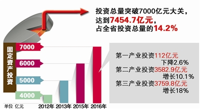 2016年,在服務(wù)業(yè)投資的強(qiáng)力推動下,青島市固定資產(chǎn)投資保持了溫和換擋發(fā)展,投資總量突破7000億元大關(guān),達(dá)到7454.7億元,占全省投資總量的比重為14.2%,占比同比提升0.4個(gè)百分點(diǎn);投資增速13.7%,分別高于全國、全省平均增速5.6個(gè)和3.2個(gè)百分點(diǎn)。