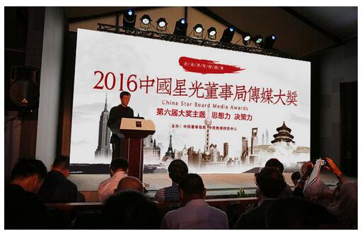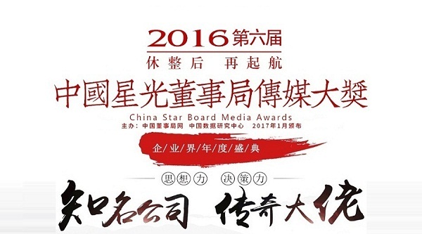 2017年1月19日,被譽(yù)為中國企業(yè)董事會最高榮譽(yù)獎項(xiàng)的2016第六屆“中國星光董事局傳媒大獎”在北京隆重揭曉。本屆大獎以思想力和決策力為主題,力圖展現(xiàn)大時代背景下,中國領(lǐng)袖企業(yè)者對未來和趨勢的前瞻性思考。
