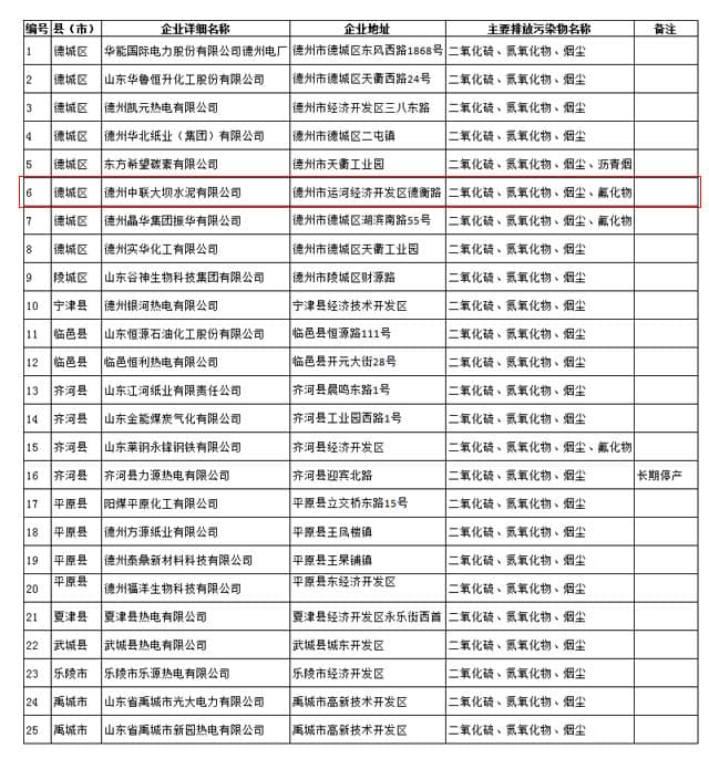 德州市2016年重點大氣污染源中包含一家水泥企業(yè)(德州中聯(lián)大壩水泥有限公司),2017年表中所涉及的企業(yè)可能會被被被重點監(jiān)控。