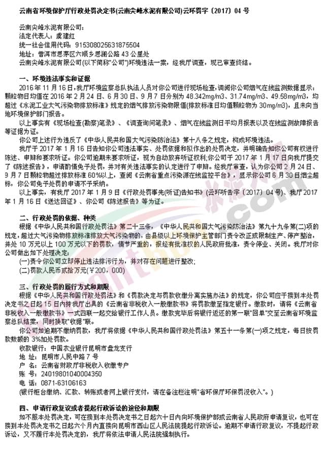 云南環(huán)保今天開出四張罰單 西南水泥被罰25萬元