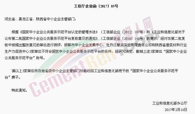 根據(jù)《國(guó)家中小企業(yè)公共服務(wù)示范平臺(tái)認(rèn)定的管理辦法》(工信部企業(yè)〔2012〕197號(hào))和《工業(yè)和信息化部關(guān)于公布第二批國(guó)家中小企業(yè)公共服務(wù)示范平臺(tái)復(fù)核意見(jiàn)的通知》(工信部企業(yè)〔2016〕148號(hào))的要求,經(jīng)對(duì)在第二批復(fù)核中被提出整改意見(jiàn)的單位進(jìn)行測(cè)評(píng),邯鄲市中小企業(yè)發(fā)展中心、牡丹江敏堯?qū)崢I(yè)有限責(zé)任公司和陜西省建筑材料行業(yè)生產(chǎn)力促進(jìn)中心3家單位不符合國(guó)家中小企業(yè)公共服務(wù)示范平臺(tái)的條件,經(jīng)研究決定,撤銷上述3家單位“國(guó)家中小企業(yè)公共服務(wù)示范平臺(tái)”稱號(hào)。