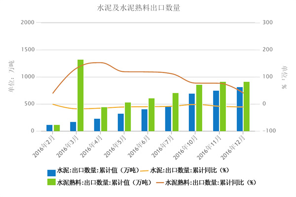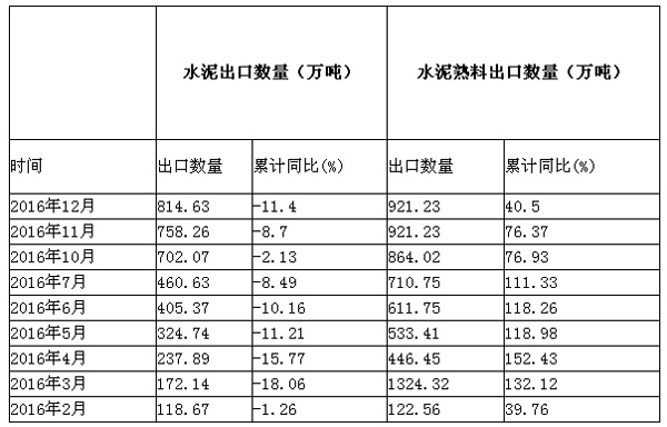 據(jù)有關(guān)數(shù)據(jù)顯示,2016年我國(guó)水泥出口數(shù)量為814.63萬(wàn)噸,同比2015年減少了11.4%,水泥熟料2016年共出口921.23萬(wàn)噸,累計(jì)同比增長(zhǎng)了40.5%。