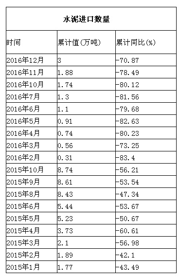 相關數(shù)據(jù)庫數(shù)據(jù)顯示,2016年我國水泥進口數(shù)量累計3萬噸,累計同比下降70.87%,進口量持續(xù)大幅下跌,也進一步反映了國內(nèi)水泥產(chǎn)能過剩矛盾突出問題。