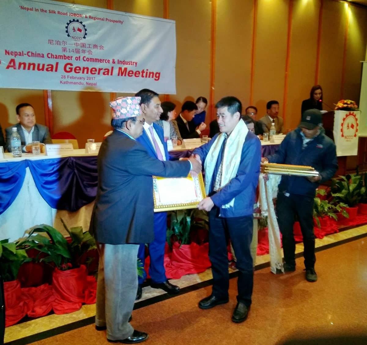 會上,尼中工商會向兩國貿(mào)易促進、旅游發(fā)展、投資開發(fā)三大領(lǐng)域的貢獻方頒發(fā)了榮譽獎。尼泊爾紅獅希望水泥公司獲得了投資開發(fā)領(lǐng)域的榮譽獎。