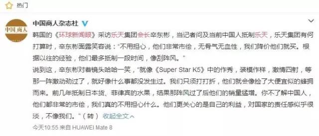 據(jù)中國商人雜志社消息:在《環(huán)球新聞眼》采訪樂天集團會長時,當記者問及當前中國人抵制樂天,樂天集團有何打算,他面露笑容說: