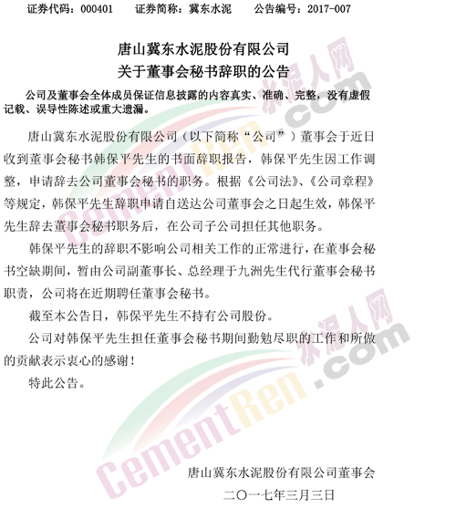 冀東水泥3月3日晚間公告,公司董事會近日收到董事會秘書韓保平先生的書面辭職報(bào)告,韓保平先生因工作調(diào)整,申請辭去公司董事會秘書的職務(wù)。韓保平先生辭去董事會秘書職務(wù)后,在公司子公司擔(dān)任其他職務(wù)。