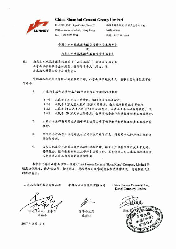 本命令已得到山東山水唯一股東China Pioneer Cement (Hong Kong) Company Limited的股東決議批準(zhǔn),請(qǐng)嚴(yán)格執(zhí)行,如有違反,將按照公司規(guī)章制度和相關(guān)法律法規(guī),追究相關(guān)人員的法律責(zé)任。
