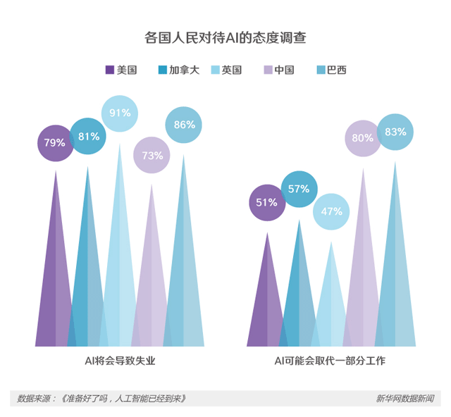 根據(jù)相關(guān)調(diào)查結(jié)果顯示,面對即將到來的人工智能時代,英國人對于自己的工作有強烈的危機(jī)感。相對來說,中國、巴西等新興市場國家對于人工智能帶來的挑戰(zhàn)保持相對樂觀。
