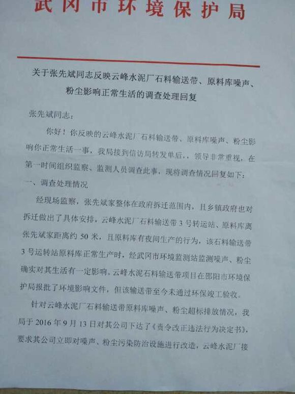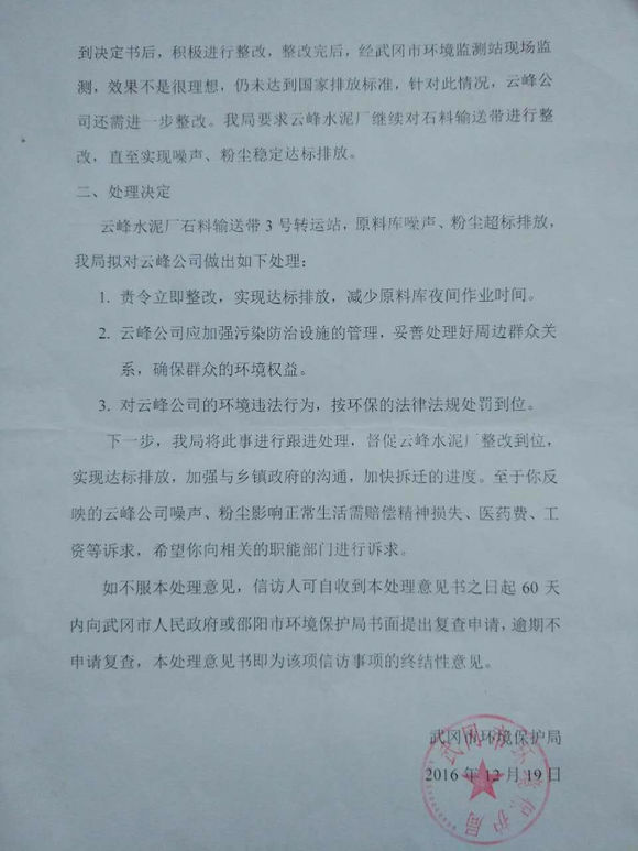 第三個決定是對云峰水泥廠的環(huán)境違法行為,“按環(huán)保的法律法規(guī)處罰到位”。2016年9月13日,環(huán)保局就下達(dá)了《責(zé)令改正違法行為決定書》,然后,至今都未有效改正其違法行為。我們懷疑環(huán)保局的執(zhí)法力度。而且,到底如何處罰云峰水泥廠的,我們有權(quán)知道。