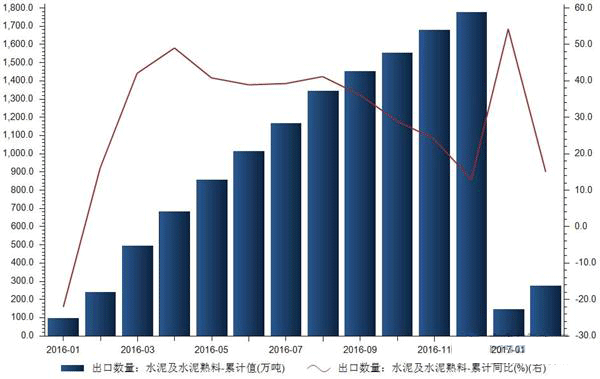 2017年1-2月國(guó)內(nèi)水泥及水泥熟料出口數(shù)量累計(jì)275萬(wàn)噸,累計(jì)同比增長(zhǎng)15%。