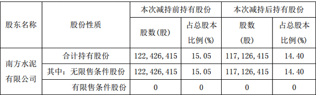 南方水泥自 2016 年 12 月 13 日至 2017 年 3 月 24 日期間通過大宗交易方式累計(jì)減持 59,980,900 股,減持股份比例占公司總股本的 7.37%。自最近一次披露權(quán)益變動(dòng)報(bào)告書起至本次減持后,南方水泥累計(jì)減持公司股份 19,300,000 股,占公司總股本的 2.37%。