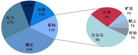 其次,產能的開關成本及生產成本相對較低。從近幾年價格出現(xiàn)大幅波動的原因不難看出一點,產能的發(fā)揮程度直接導致價格波動的大小。16年底至17年初,由于環(huán)保檢查要求嚴格、錯峰停產政策落實到位,地區(qū)水泥、熟料供給趨緊,導致水泥價格堅挺、熟料價格一度出現(xiàn)淡季上漲的情況。如河南部分地區(qū)16年8月份開始的環(huán)保整治和錯峰停產,力度從產能發(fā)揮控制50%以內到全面停產,導致P.O42.5散裝價格從260元/噸飆升至最高450元噸,最高單次漲幅高達驚人的100元/噸。另一方面水泥、熟料的生產成本相對較低,該屬性決定了其產能相對可控。17年2月份指數(shù)提前出現(xiàn)上漲也是因為華東地區(qū)大范圍30-45天的錯峰停產導致。從水泥的生產成本上來看,主要的成本集中在煤炭和電力上,兩者相加約占總成本的62%,因此以上兩者的價格波動也影響水泥的價格調整。