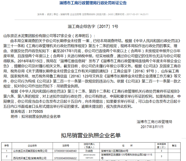 昨日(20170330)上午,記者從淄博市工商局了解到,山東崇正水泥集團股份有限公司等27家企業(yè)因連續(xù)兩個年度以上(含兩年)未按規(guī)定申報并公示年度年報、且連續(xù)兩個年度以上(含兩年)未進行納稅申報被依法吊銷營業(yè)執(zhí)照。