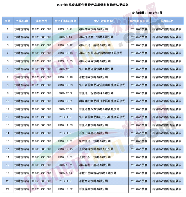 3月29日,紹興市質(zhì)量技術(shù)監(jiān)督局官網(wǎng)公布2017年一季度紹興市水泥包裝袋產(chǎn)品市級(jí)監(jiān)督抽查結(jié)果(總體評(píng)價(jià)類(lèi)),抽查了柯橋區(qū)、上虞區(qū)和嵊州市等6個(gè)地區(qū)21家企業(yè)的21批次水泥包裝袋產(chǎn)品,不合格0批次。