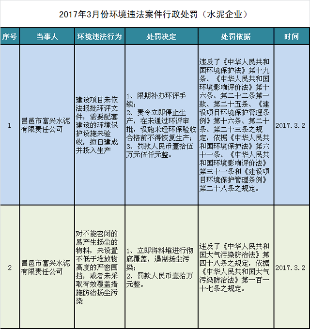 據(jù)處罰信息顯示,昌邑市富興水泥有限責(zé)任公司因“建設(shè)項(xiàng)目未依法報(bào)批環(huán)評(píng)文件,需要配套建設(shè)的環(huán)境保護(hù)設(shè)施未驗(yàn)收,擅自建成并投入生產(chǎn)”和“對(duì)不能密閉的易產(chǎn)生揚(yáng)塵的物料,未設(shè)置不低于堆放物高度的嚴(yán)密?chē)鷵酰蛘呶床扇∮行Ц采w措施防治揚(yáng)塵污染”等環(huán)境違法行為分別被處以“限期補(bǔ)辦環(huán)評(píng)手續(xù);責(zé)令立即停止生產(chǎn),在未通過(guò)環(huán)評(píng)審批,設(shè)施未經(jīng)環(huán)保驗(yàn)收合格前不得恢復(fù)生產(chǎn);罰款人民幣壹拾伍萬(wàn)元伍仟元整”和“立即將料堆進(jìn)行徹底覆蓋,遏制揚(yáng)塵污染;罰款人民幣壹拾萬(wàn)元整”處罰。