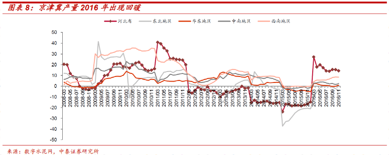 從產量角度看,京津冀地區(qū)水泥產量(以河北為主)在2016年出現了明顯回暖趨勢。我們認為隨著京津冀一體化的不斷推進,區(qū)域內水泥總體需求仍能維持穩(wěn)定增長。