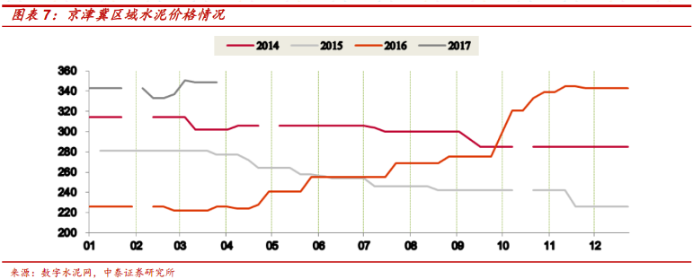 從供給去化規(guī)劃的角度看,2016年河北省全年壓減水泥產能286萬噸,超額完成全年供給側改革150萬噸的規(guī)劃目標;根據規(guī)劃,河北省2017年底將把熟料產能控制在9000萬噸以內、規(guī)劃壓縮水泥產能6000萬噸。按照這一數據,區(qū)域內水泥的產能利用率將提升到60%以上。建立在當前區(qū)域內基本沒有新增產能的基礎上,我們認為2017年京津冀區(qū)域內的供給端壓力將持續(xù)降低。