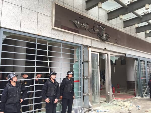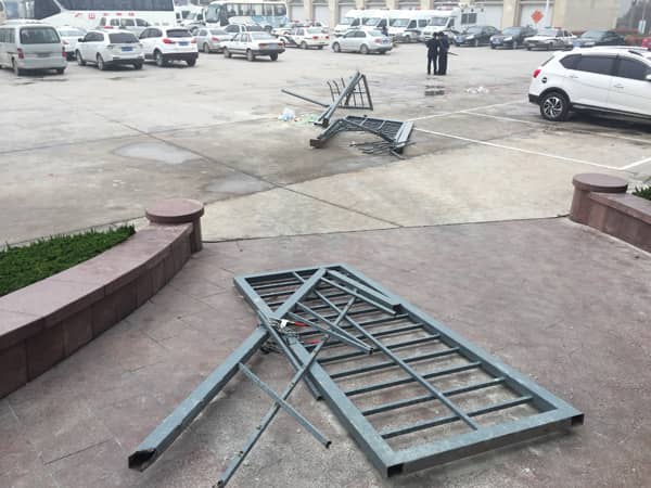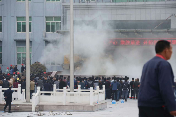 由于辦公樓外有鋼結構大門,來者未能第一時間破門。“大概僵持了兩個小時左右,他們搶奪了廠區(qū)內一輛推土機撞擊大門。”該人士告訴記者,鋼結構大門瞬間被撞爛,鋼化玻璃散落一地。