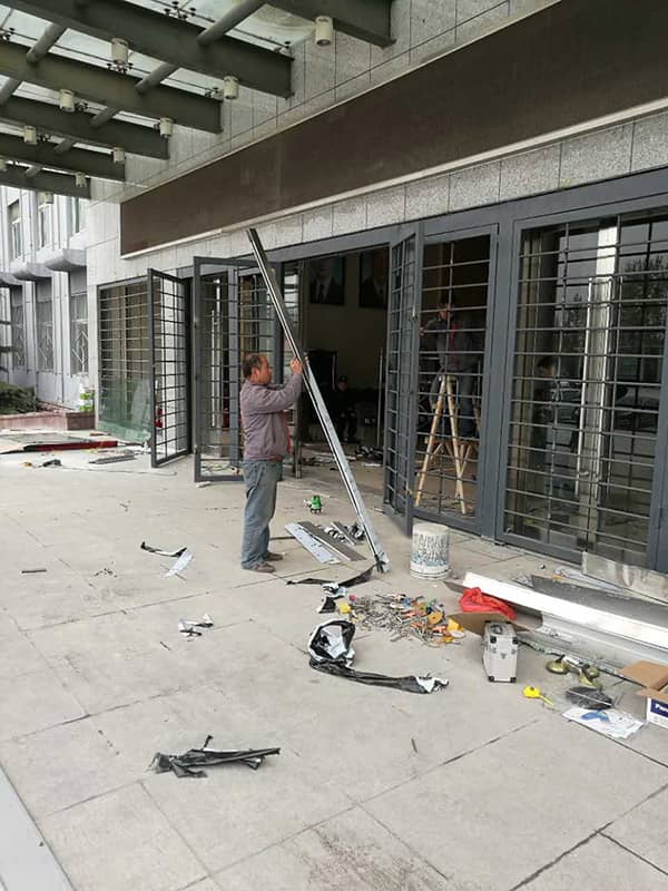 10日,記者在現(xiàn)場看到,山水集團辦公樓大門玻璃仍處于破碎狀態(tài),不過,鋼結構大門已經重新焊接安裝。