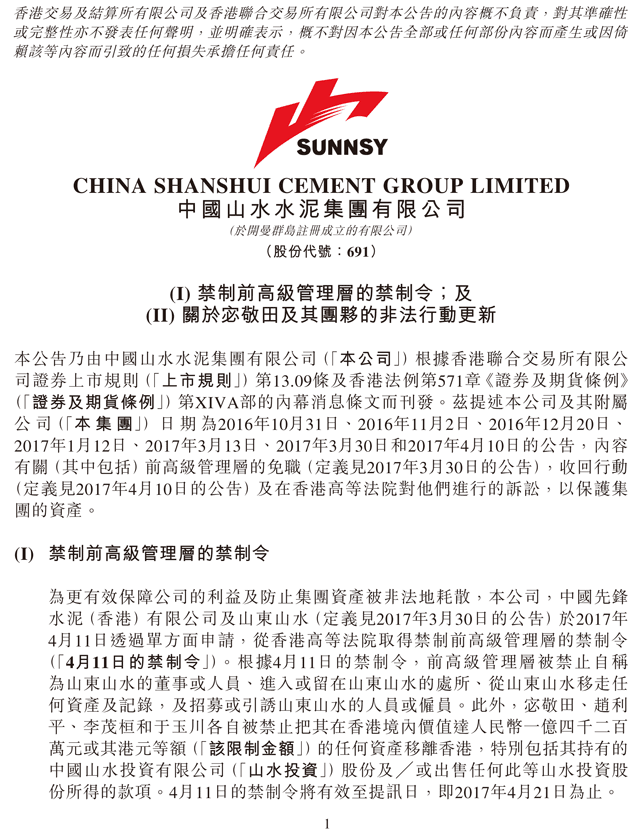 山水水泥(00691-HK):要求盡早釋放與案件無關(guān)被拘職工山水水泥(00691-HK)周三晚間發(fā)布關(guān)于宓敬田及其團伙的非法行動更新稱,于2017年4月11日,公司中國法律顧問前往濟南市公安局長清分局及長清分局轄下的崮山派出所并得知: