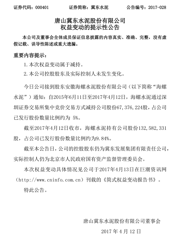 4月12日晚間,冀東水泥(000401)公告稱,當(dāng)日接到股東海螺水泥(600585)通知,自2015年6月11日至2017年4月12日,海螺水泥通過深圳證券交易所集中競價交易方式減持公司股份67,376,224股,占公司已發(fā)行股份數(shù)量比例約5%。