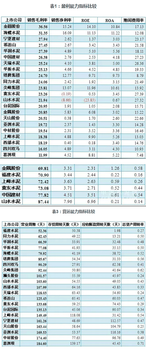 綜合比較,華潤(rùn)水泥、華新水泥、海螺水泥、塔牌集團(tuán)的整體營(yíng)運(yùn)能力排位靠前,不僅營(yíng)業(yè)周期較短,總資產(chǎn)的周轉(zhuǎn)效率也比較高;青松建化(600425,股吧)、中國(guó)建材、天山股份(000877,股吧)、冀東水泥(000401,股吧)在營(yíng)業(yè)周期和資產(chǎn)周轉(zhuǎn)方面的營(yíng)運(yùn)能力均有待提升。
