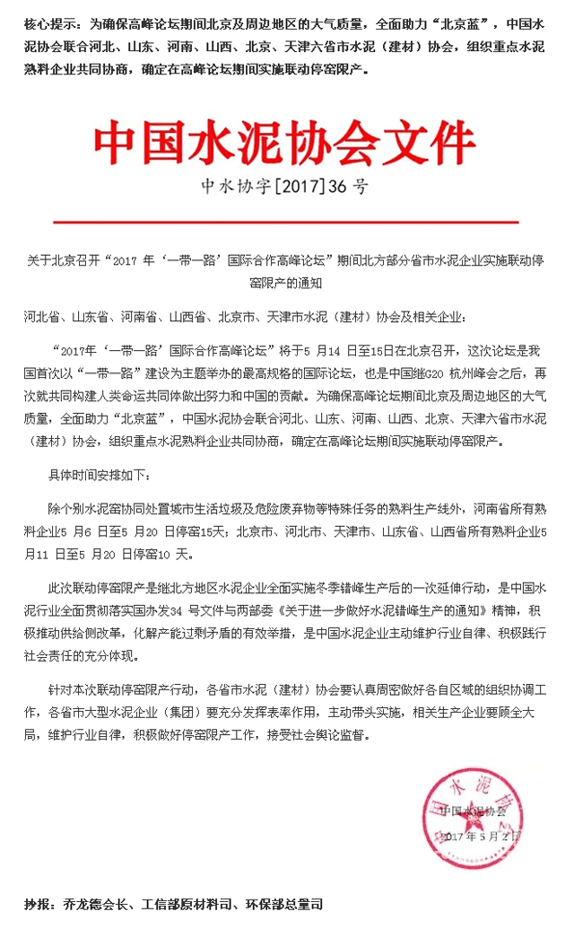為確保高峰論壇期間北京及周邊地區(qū)的大氣質(zhì)量,全面助力“北京藍(lán)”,中國水泥協(xié)會(huì)聯(lián)合河北、山東、河南、山西、北京、天津六省市水泥(建材)協(xié)會(huì),組織重點(diǎn)水泥熟料企業(yè)共同協(xié)商,確定在高峰論壇期間實(shí)施聯(lián)動(dòng)停窯限產(chǎn)。