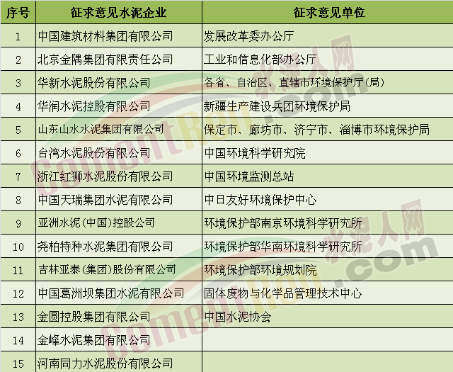 為落實(shí)《控制污染物排放許可制實(shí)施方案》,加快建立和完善覆蓋所有固定污染源的企事業(yè)單位控制污染物排放許可制,環(huán)境保護(hù)部組織制定了《排污許可證申請(qǐng)與核發(fā)技術(shù)規(guī)范 水泥工業(yè)(征求意見稿)》。近日,環(huán)境保護(hù)部發(fā)布關(guān)于征求《排污許可證申請(qǐng)與核發(fā)技術(shù)規(guī)范 水泥工業(yè)(征求意見稿)》國家環(huán)境保護(hù)標(biāo)準(zhǔn)意見的函。征求意見單位名單中包括:中國水泥協(xié)會(huì)及中建材、金隅水泥、華新水泥、華潤水泥等15家區(qū)域龍頭企業(yè)