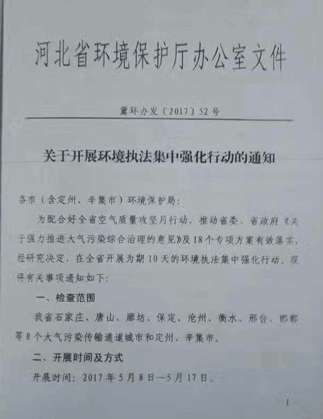 日前,河北省環(huán)境保護(hù)廳下發(fā)《關(guān)于開(kāi)展環(huán)境執(zhí)法集中強(qiáng)化行動(dòng)的通知》,通知要求唐山、廊坊、邢臺(tái)、邯鄲等8個(gè)大氣污染傳輸通道城市于2017年5月8日-5月17日,加大執(zhí)行力度,嚴(yán)厲查處大氣環(huán)境違法行為,重點(diǎn)行業(yè)為水泥等常年運(yùn)行燃煤鍋爐等高架源,不能穩(wěn)定達(dá)標(biāo)排放企業(yè)一律停產(chǎn)整頓。