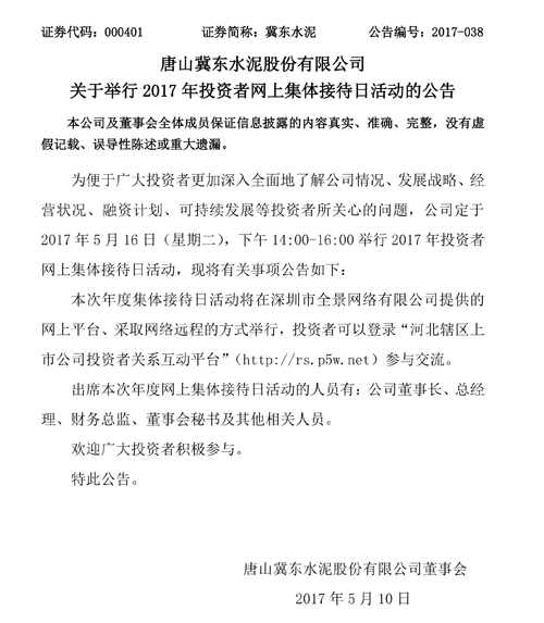 昨日(10日)晚間唐山冀東水泥股份有限公司發(fā)布關(guān)于舉行2017年投資者網(wǎng)上集體接待日活動(dòng)的公告稱:為便于廣大投資者更加深入全面地了解公司情況、發(fā)展戰(zhàn)略、經(jīng)營狀況、融資計(jì)劃、可持續(xù)發(fā)展等投資者所關(guān)心的問題,公司定于2017年5月16日(星期二),下午14:00-16:00舉行2017年投資者網(wǎng)上集體接待日活動(dòng)。