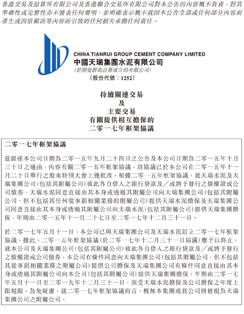 中國天瑞水泥(01252-HK)公告,于2017年5月11日,公司已與控股股東天瑞集團(tuán)公司及公司附屬天瑞水泥訂立2017年框架協(xié)議,據(jù)此,2015年框架協(xié)議應(yīng)予以終止。公司及天瑞集團(tuán)公司(包括其附屬公司)彼此各自借入的銀行貸款、將予發(fā)行的債權(quán)證或公司債券,公司與天瑞集團(tuán)公司同意相互提供擔(dān)保,但公司不為天瑞集團(tuán)公司從事鋁相關(guān)業(yè)務(wù)的附屬提供擔(dān)保。年期由2017年5月11日至2019年12月31日。公司擔(dān)保的每日結(jié)余上限為30億元,天瑞集團(tuán)擔(dān)保的每日結(jié)余上限為70億元。