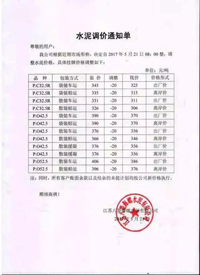江蘇八菱海螺水泥有限公司調(diào)價函: