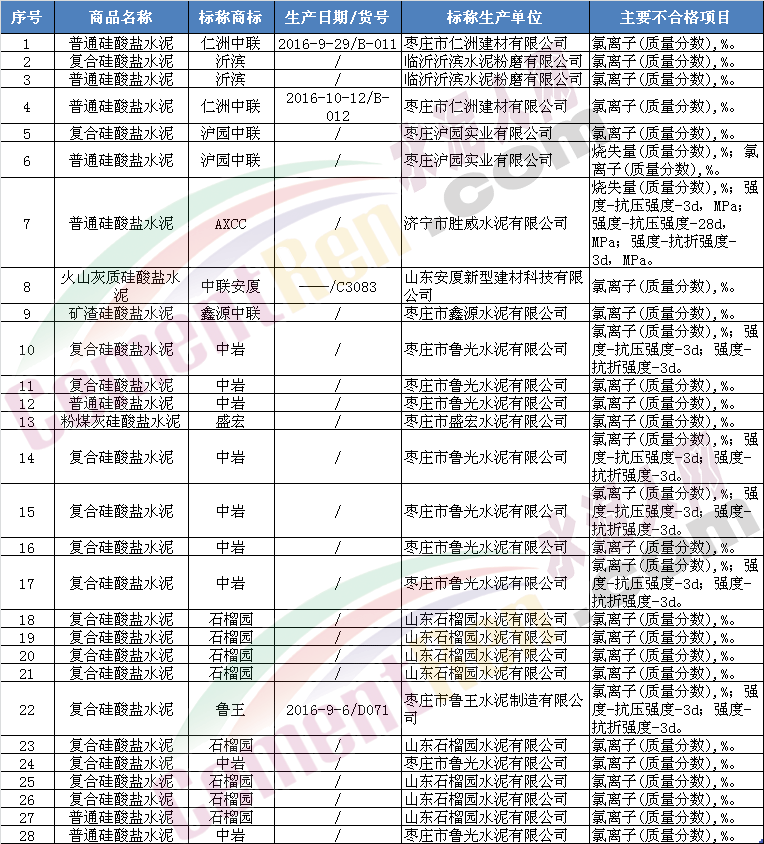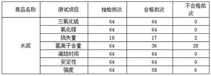 本次抽檢依據(jù)GB175-2007《通用硅酸鹽水泥》、XG2-2014《GB175-2007第二號(hào)修改單》3、CCGF404-2015《水泥產(chǎn)品質(zhì)量監(jiān)督抽查實(shí)施規(guī)范》等標(biāo)準(zhǔn),抽檢范圍涉及連云港、淮安、宿遷、揚(yáng)州和泰州等5個(gè)地市。檢測項(xiàng)目為:三氧化硫、氧化鎂、燒失量、氯離子含量、不溶物、凝結(jié)時(shí)間、安定性、強(qiáng)度等。抽檢發(fā)現(xiàn)28個(gè)批次不合格,不合格項(xiàng)目為強(qiáng)度、氯離子和燒失量3個(gè)項(xiàng)目,均為嚴(yán)重不合格項(xiàng)目。