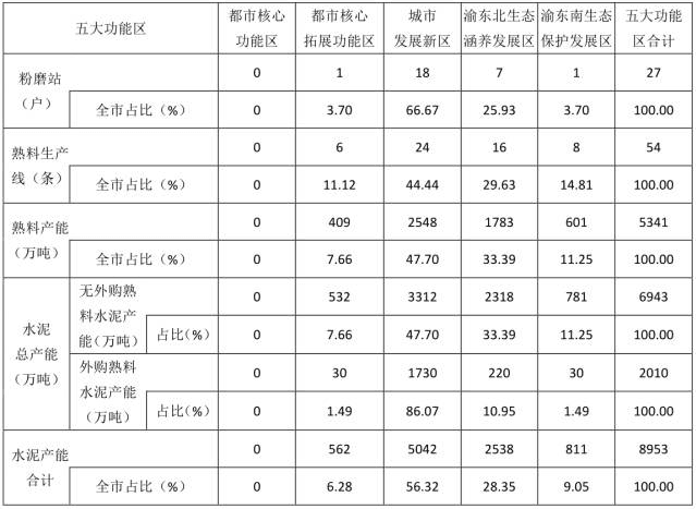 說(shuō)明:(1)因貫徹落實(shí)渝府發(fā)[2014]24號(hào)文件精神,都市核心功能區(qū)1戶水泥企業(yè)、2條生產(chǎn)線,2016年底政府強(qiáng)行關(guān)閉,故未在統(tǒng)計(jì)數(shù)內(nèi)。(2)水泥產(chǎn)業(yè)布局集中在城市發(fā)展新區(qū)12個(gè)區(qū)縣,符合五大功能區(qū)定位。
