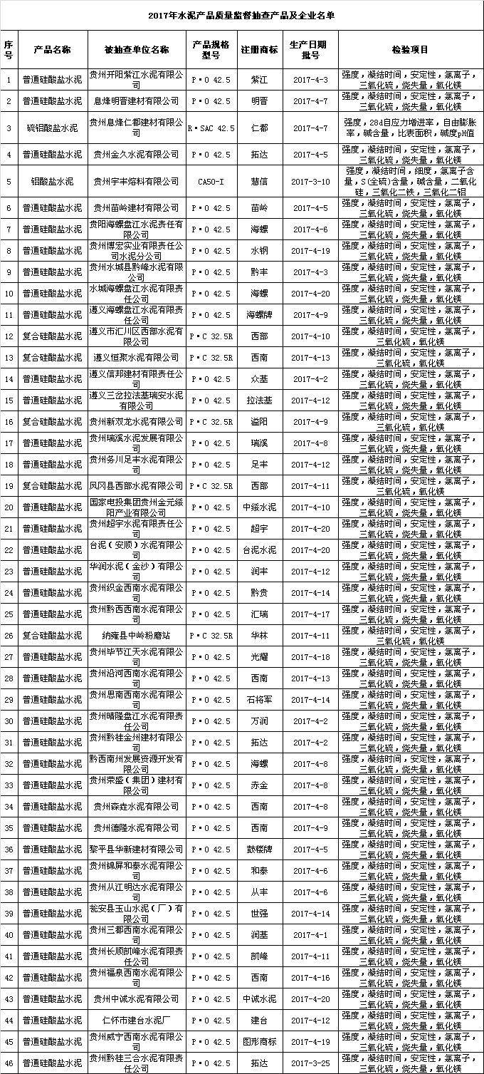 貴州省質(zhì)量技術(shù)監(jiān)督局官網(wǎng)公布2017年水泥產(chǎn)品質(zhì)量監(jiān)督抽查結(jié)果。本次抽查涉及貴陽(yáng)市、遵義市、六盤水市、安順市、畢節(jié)市、銅仁市、黔東南州、黔南州、黔西南州、仁懷市和威寧縣46家企業(yè)生產(chǎn)的水泥產(chǎn)品46個(gè)批次。未檢出問(wèn)題產(chǎn)品。