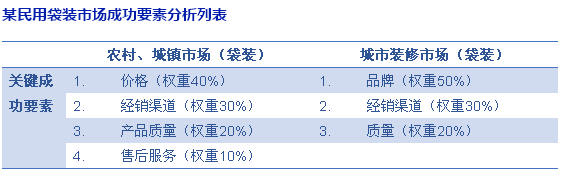 一個(gè)好的競(jìng)爭(zhēng)戰(zhàn)略是以客戶(hù)群體(市場(chǎng)細(xì)分)為基礎(chǔ)的,策略制定人員必須對(duì)不同客戶(hù)群體需求特征有深刻了解??梢钥紤]按特定相關(guān)客戶(hù)(細(xì)分市場(chǎng))需求特點(diǎn),分別考慮。譬如民用市場(chǎng)、工業(yè)市場(chǎng)是兩個(gè)基本的市場(chǎng)細(xì)分類(lèi)型,在民用市場(chǎng)下面,還可以繼續(xù)細(xì)分為農(nóng)村城鎮(zhèn)市場(chǎng)與城市裝修市場(chǎng),工業(yè)市場(chǎng)也可以細(xì)分為性能驅(qū)動(dòng)型、價(jià)格驅(qū)動(dòng)型與關(guān)系驅(qū)動(dòng)型。在這眾多的客戶(hù)類(lèi)型中,客戶(hù)的需求特征是不一樣的,企業(yè)成功要素理所當(dāng)然不一樣。舉例說(shuō)明水泥企業(yè)民用市場(chǎng)成功要素分析如下: