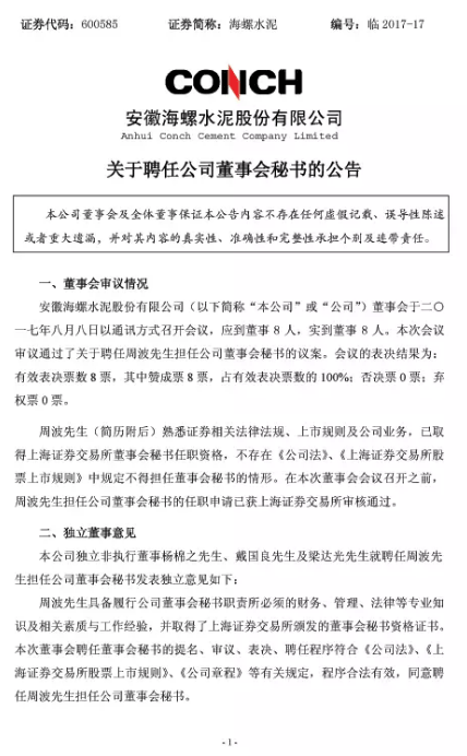 海螺水泥昨日(8日)晚間發(fā)布公告,周波已獲委任為公司聯(lián)席公司秘書(shū),以填補(bǔ)楊開(kāi)發(fā)離職后的空缺,任命于2017年8月8日生效。周波將與公司現(xiàn)時(shí)的公司秘書(shū)趙不渝共同出任聯(lián)席公司秘書(shū)職務(wù)。周波亦獲委任為董事會(huì)秘書(shū),任命于2017年8月8日生效。