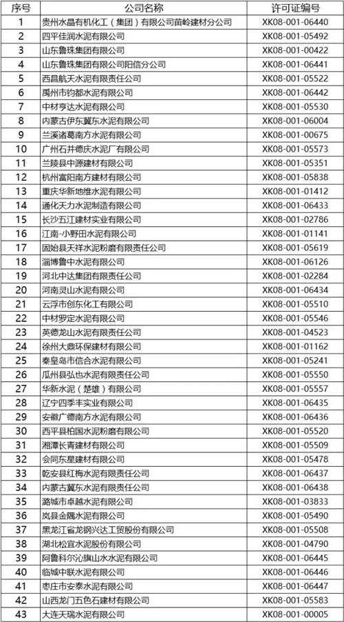 8月11日,國(guó)家質(zhì)檢總局發(fā)布最新獲證企業(yè)名單,其中涉及43家水泥企業(yè),其中包括延續(xù)、延續(xù)名稱(chēng)許可范圍變更、發(fā)證等內(nèi)容。水泥人網(wǎng)將會(huì)在第一時(shí)間將最新獲證企業(yè)名單予以發(fā)布。