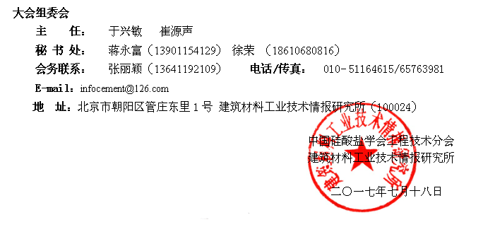會(huì)議將同期出版發(fā)行會(huì)議論文集,歡迎踴躍投稿。提交論文格式為WORD文檔格式, 征文截止日期為2017年9月5日,論文經(jīng)專家評(píng)審遴選后收入大會(huì)論文集,論文接收郵箱infocement@126.com。