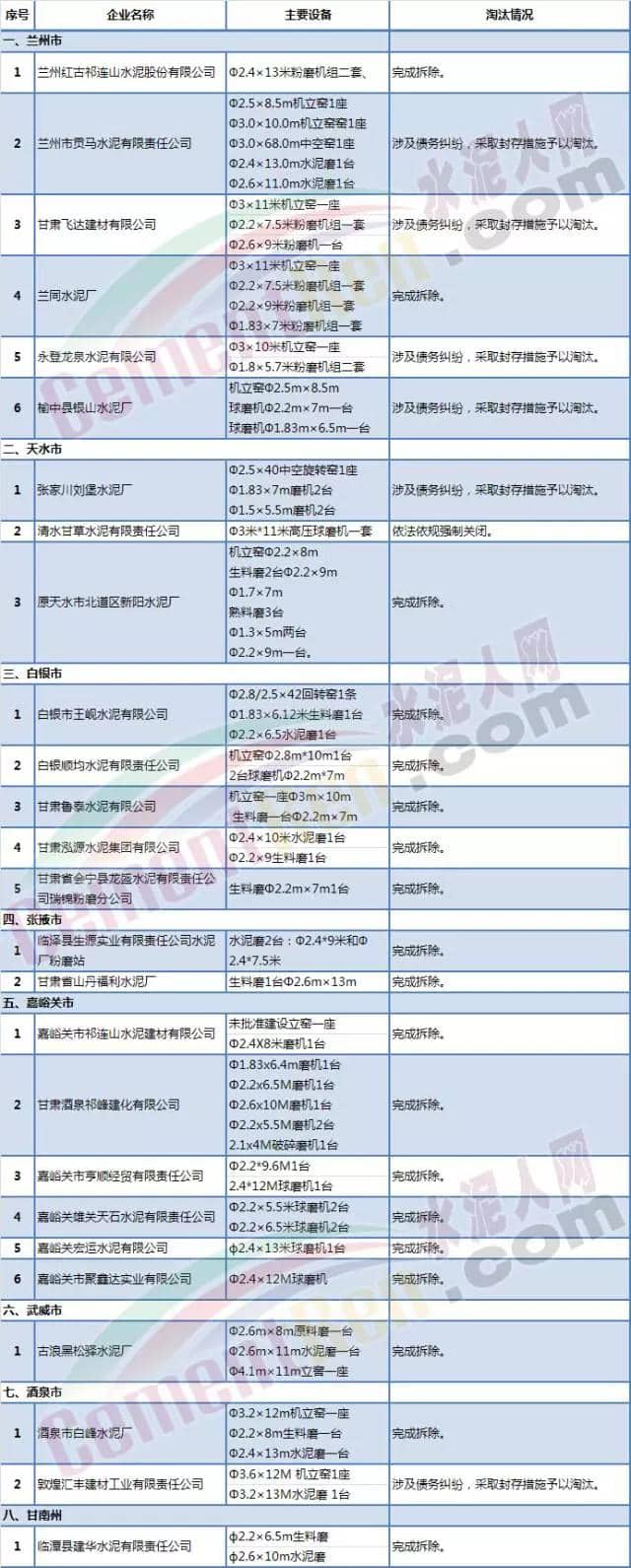 甘肅省水泥落后產(chǎn)能淘汰完成情況表