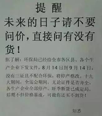 重要提示:環(huán)保局已經(jīng)給全市各縣各個生產(chǎn)企業(yè)下發(fā),8月14日到9月14日,沒有三證的配合環(huán)保,停產(chǎn)整改。十九大期間,全運會期間,無論證件是否齊全,各生產(chǎn)企業(yè)全部停產(chǎn),旺季斷貨已成定局!