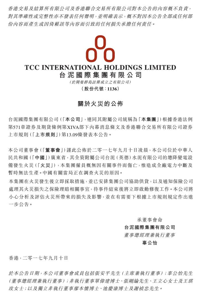 (經(jīng)濟日報9月10日消息)臺泥旗下廣東英德廠今日(10日)凌晨發(fā)生火警,廠內總降變電設備意外發(fā)生火災,公司強調,所幸現(xiàn)場無人員傷亡,不過受限于全廠電力中斷暫時無法生產(chǎn),修復時間仍在評估中,目前有賴廣東龍山廠與廣西貴港廠支援。