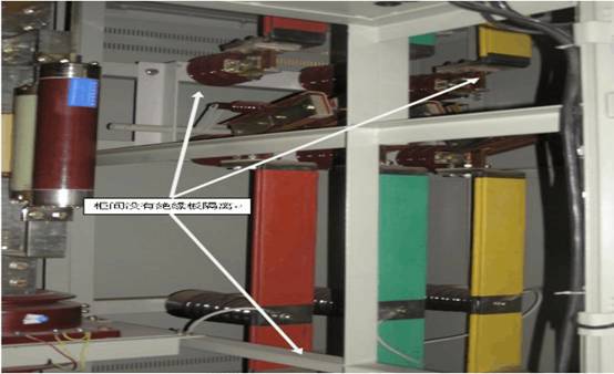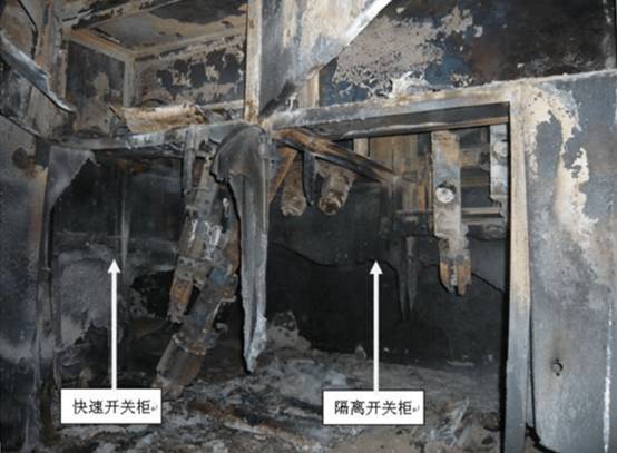 一層6kV開關室Ⅱ段母排上快速開關柜(含隔離刀)損壞最為嚴重,快速開關的下樁頭與隔離刀連接母排全部熔融,C相母排不復存在,柜體前門、側護板全部炸飛。 因短路爆炸產(chǎn)生了巨大的沖擊力和高溫,現(xiàn)場環(huán)境及元器件均遭破壞。由于快速開關柜內連接母排存在設計不規(guī)范(母排塑封不完整,柜內母排、開關、相間和二次控制之間未隔離,熔斷器固定不可靠),特別是無泄壓通道,避雷器安裝在靠近水平母排下方,存在較為嚴重的安全隱患。