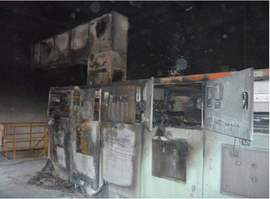 火被撲滅后檢查發(fā)現(xiàn):6kV開關室Ⅰ段母排上的母聯(lián)柜、1#發(fā)電機并網(wǎng)柜、所用變柜及Ⅱ段母排上的快速開關柜、PT柜、2#主變進線柜已徹底燒毀,6kV兩段間母線橋徹底燒毀坍塌,其余20臺開關柜均受到短路電流的沖擊和短路時的電弧熏燒、二次部分基本燒毀、柜體和手車絕緣基本被破壞,同時總降6kV室也遭受到較嚴重損壞,內部墻壁粉刷脫落,部分玻璃破碎。