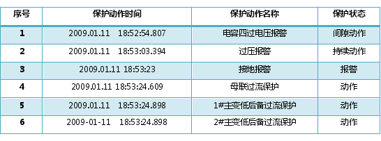 一層6kV開關室內保護設備基本燒毀,二層監(jiān)控室內保護屏及監(jiān)控計算機完好,計算機恢復上電后,監(jiān)控數(shù)據(jù)完整記錄了整個事故發(fā)生過程。保護裝置記錄的數(shù)據(jù)如下: